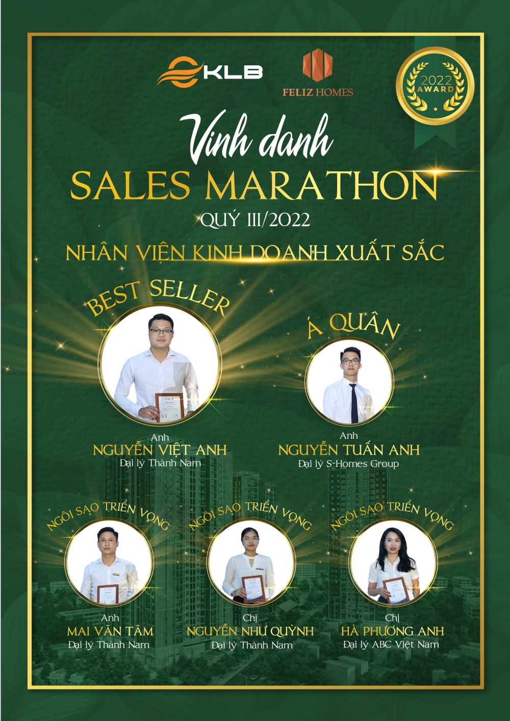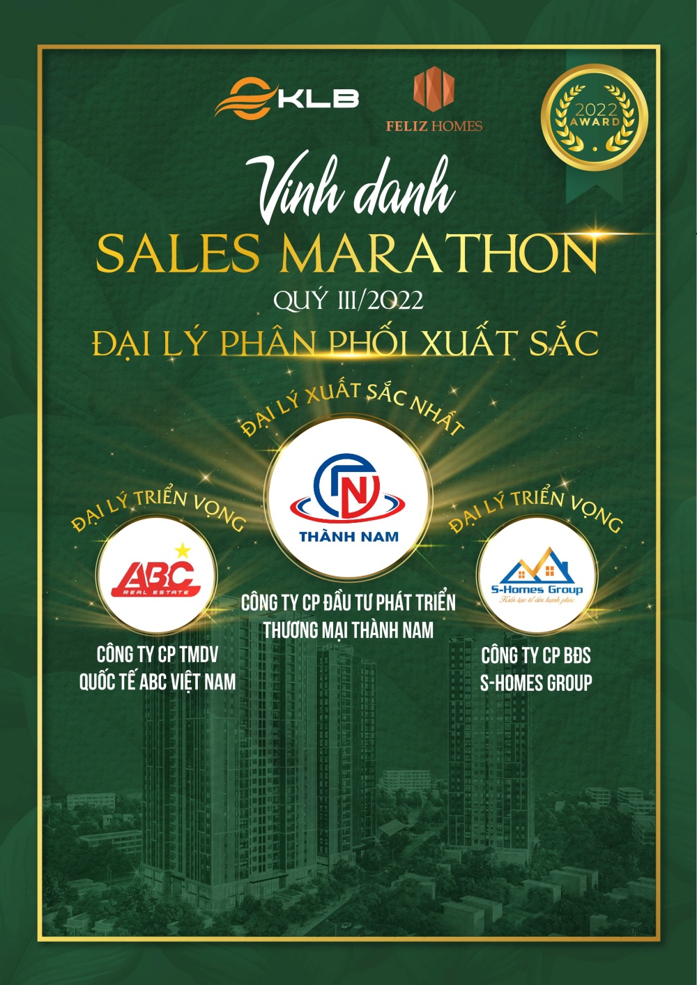 Công ty Cổ phần KLB vừa tổ chức Lễ vinh danh Sales Marathon dự án Feliz Homes giai đoạn Quý III/2022 cho những tập thể, cá nhân xuất sắc đến từ các đại lý phân phối.