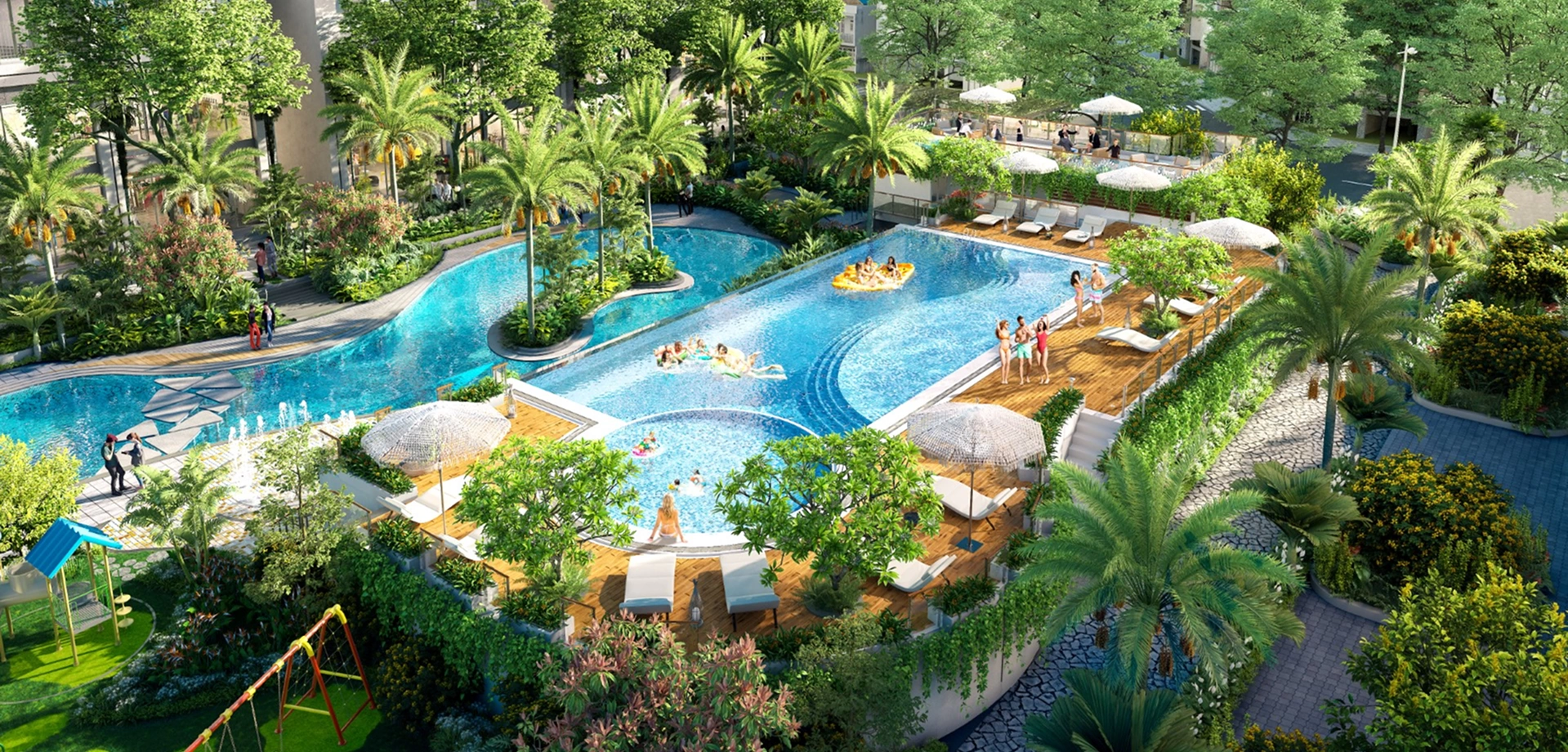 - Feliz Homes owns tropical parks with a scale of up to several thousand square meters right in the center of the project with a landscape lake system and waterfall swimming pool of nearly 1,000 square meters..