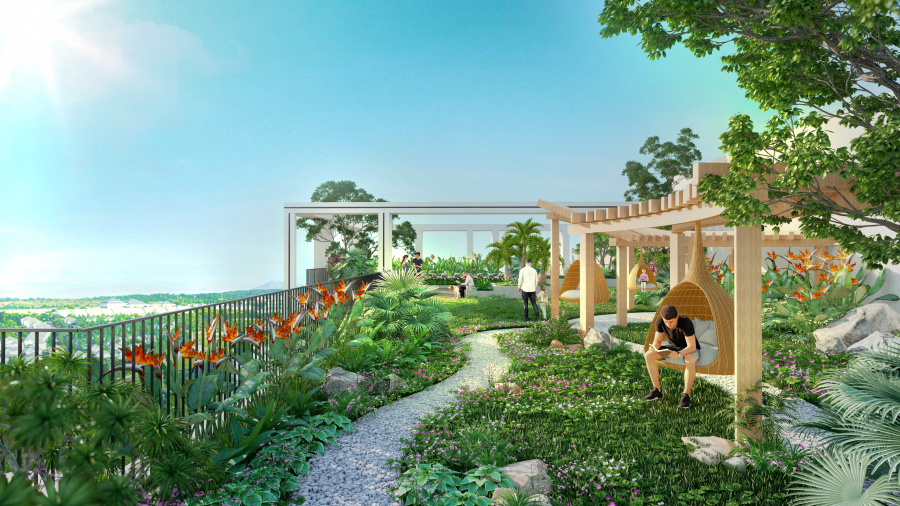Sắc xanh hiện hữu từ mặt đất cho đến những khu vườn thượng uyển chân mây trên đỉnh 3 tòa tháp, nơi mỗi cư dân có thể thảnh thơi, thư giãn sau một ngày làm việc căng thẳng, hưởng trọn những cơn gió mát lành, lặng ngắm hoàng hôn, trông phố thị lên đèn hay vươn vai hít thở trong sương mai đón chào một ngày mới.