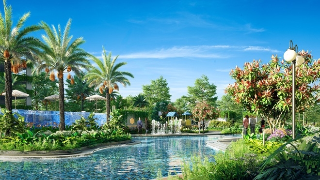 Điểm tô cho sự khoáng đạt của không gian sống là những mảng xanh rộng lớn của những dải cây xanh, mặt nước và đường dạo lên đến gần 10.000 m2 cùng hệ thống các khu vườn nhiệt đới phân bố rộng khắp dự án và hàng nghìn m2 mặt nước hồ bơi và hồ cảnh quan.